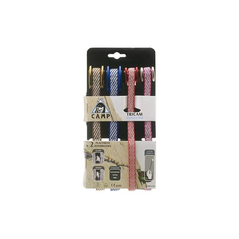 CAMP Set Tricam Dyneema includes 4 climbing nuts of the most used sizes (0.5, 1.0, 1.5, 2.0) with Dyneema webbing!