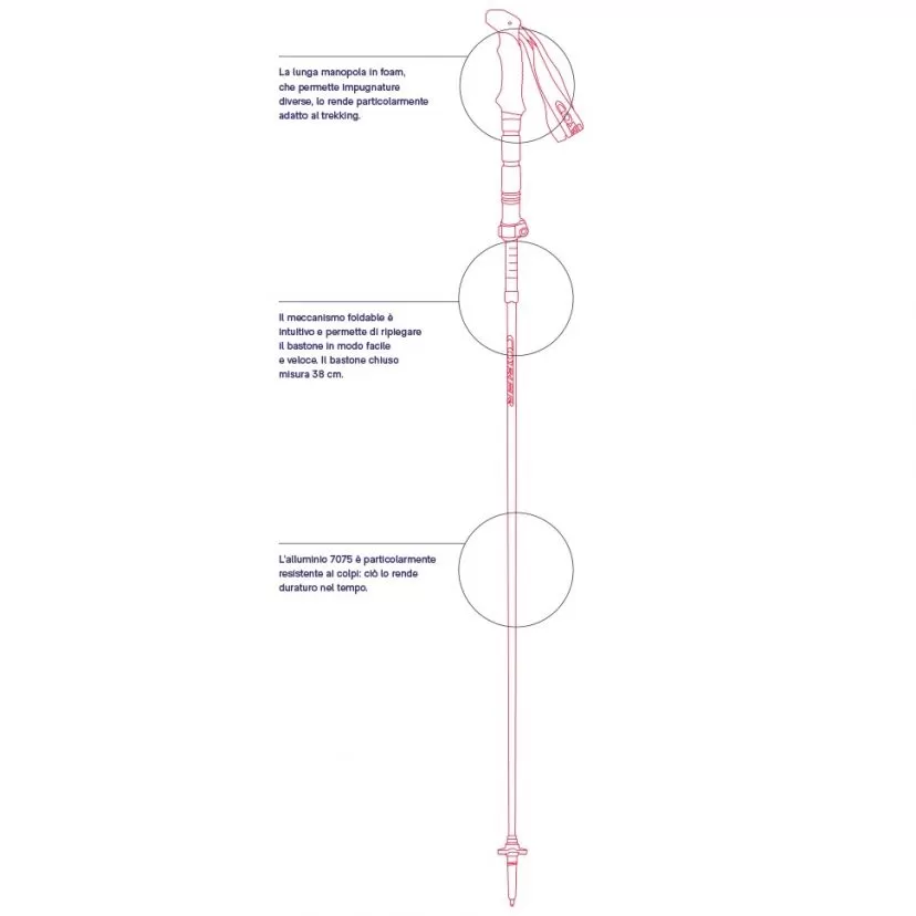 Made of 7075 aluminum it is light and resistant, weighing only 289 g. With a five-section structure, two telescopic and three foldable, it allows an adjustable length between 115-135 cm, while once closed it takes up very little space, only 38 cm. In addition, the locking system is quick and intuitive. The foam knob, comfortable and ergonomic, also continues along the stem of the pole allowing you an excellent grip even in the steepest and most technical climbs.