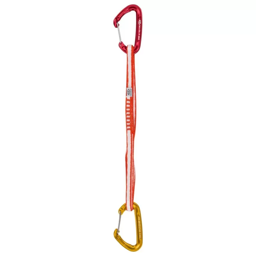 CT Climbing Technology Fly-Weight Evo Alpine Set is an ultra-light (weighs only 68 g!) mountaineering quickdraw, compact and versatile, ideal for alpine and sport routes. The preparation consists of two Fly-Weight Evo carabiners joined by a dyneema webbing ring closed by a seam and has the function of transmitting forces: this is why it was designed for a minimum load of 22 kN (equal to 2200 daN ). In the sling-carabiner coupling, both the shape of the carabiner and the width of the sling play an important role, which in this case is 10 mm, with a length of 60 cm, to overcome traverses, edges or deflect the rope from the wall. The length of the Fly-Weight Evo Alpine Set can be quickly transformed from 60 to 30 cm.