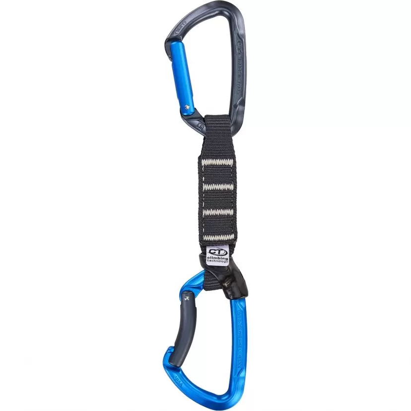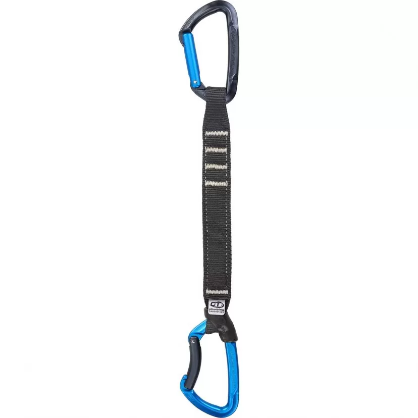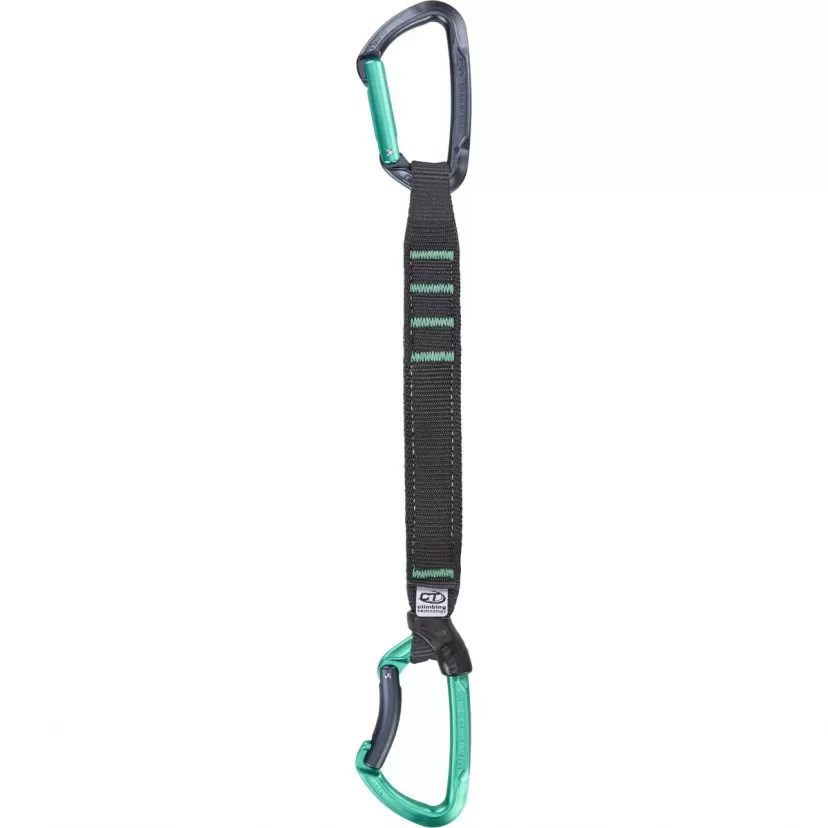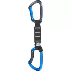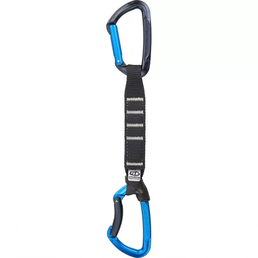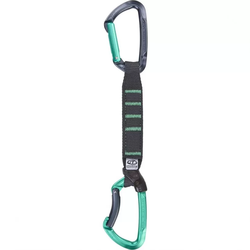 CT Climbing Technology Lime NY Pro nylon climbing quickdraw. Sturdy and versatile, it is ideal for sport climbing. The upper carabiner has a straight lever, while the lower one has a curved lever. Both take advantage of the catch-free closure that facilitates the coupling and release without the risk that the rope or other anchors become entangled. The polyamide webbing has a width varying from 25 mm to 16 mm. The rubber stopper has the purpose of preventing rotation during use and protecting it from wear.