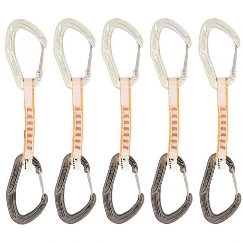 DMM Alpha Light: the lightest quickdraw ever. It owes its low weight to the 11-mm dyneema webbing, which is strong and light, and the Light carabiners, which are small and slender while retaining strength. The closed side is slightly curved in order to increase ergonomics and the tooth is repaired to prevent the carabiner from snagging.