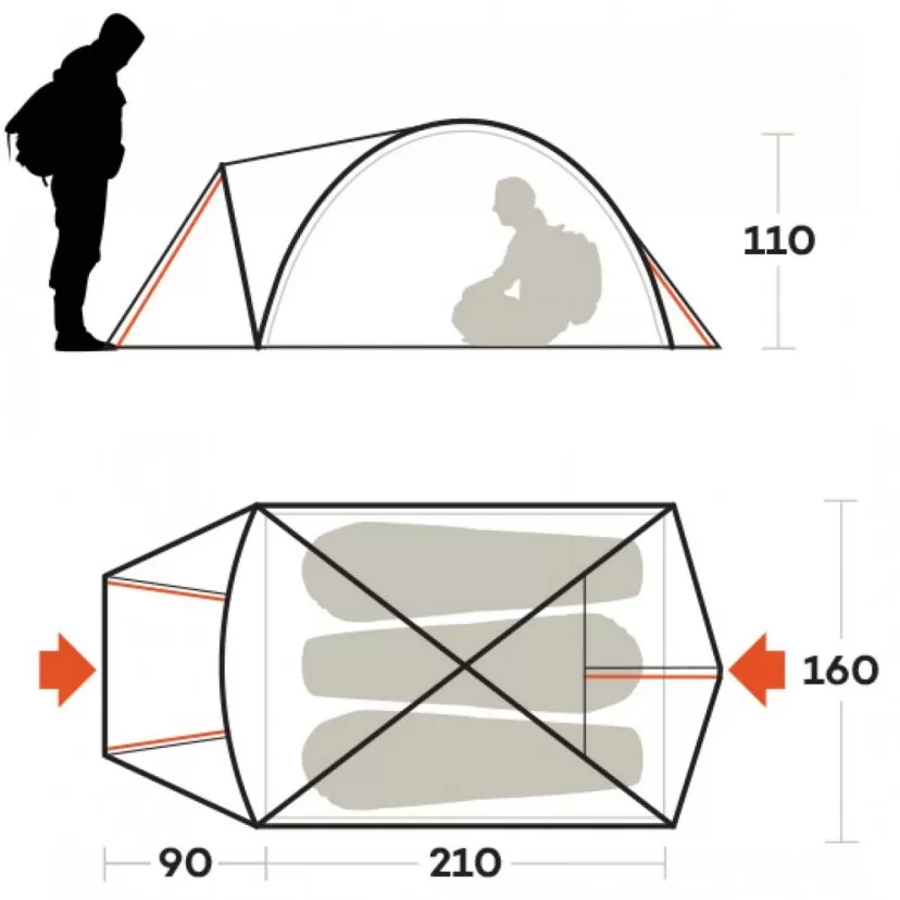The Dome structure is spacious and easy to set up, only a few quick steps are needed! Only three pre-attached fiberglass poles are needed, which are joined to the inner tent with quick-assembly hooks. To make assembly even easier, the awning arch has a different color than the others. The pegs are made of steel, so they ensure durability.