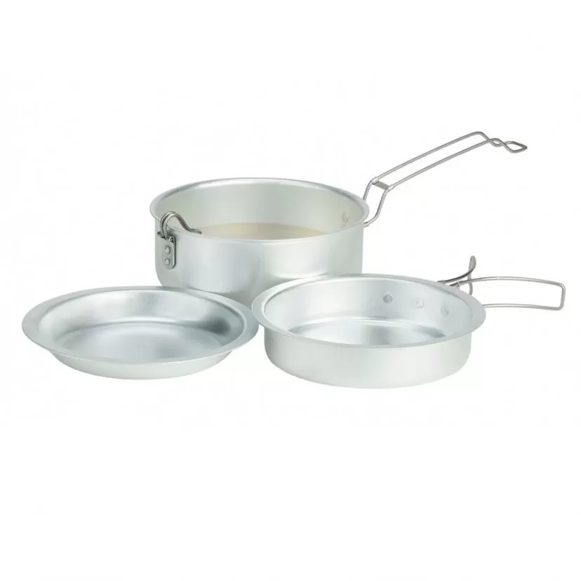 You will have a pot with closing handle (17.5 cm in diameter), a pan with folding handle and a plate made of aluminum. The whole thing is resealable in order to be easily transported!