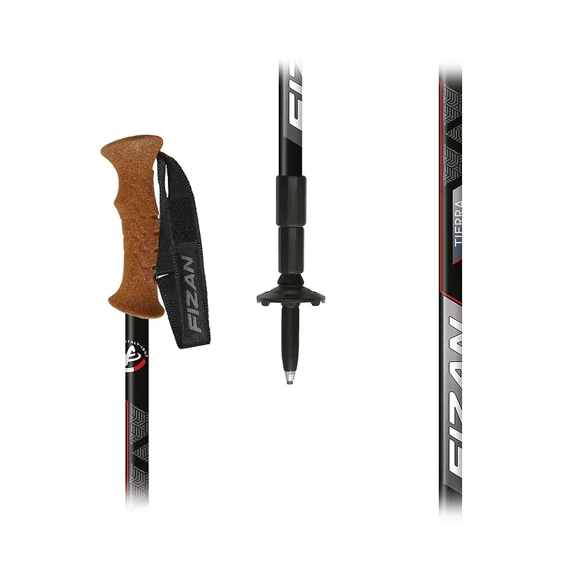 Fizan Tierra Made in Italy trekking poles made of aluminum in three sections (18/16/14 mm) extendable from 64 to 140 cm. Anatomical cork handle for a better grip. Ribbed strap in differentiated width with quick adjustment.