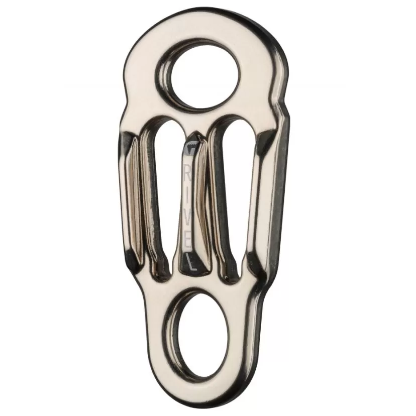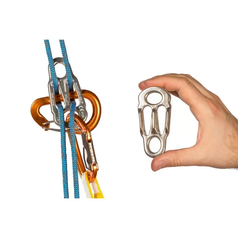 The plate has two holes, the upper one for belaying and the lower one for connection during the descent.